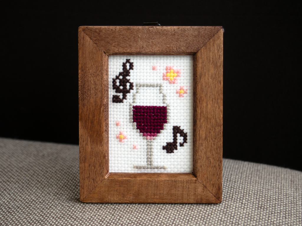 クロスステッチで作ったワインの作品を木枠フレームに閉じ込めました。
