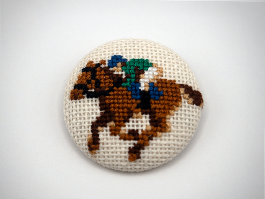 クロスステッチで作った乗馬ブローチです。競馬好きの方にピッタリな商品です。